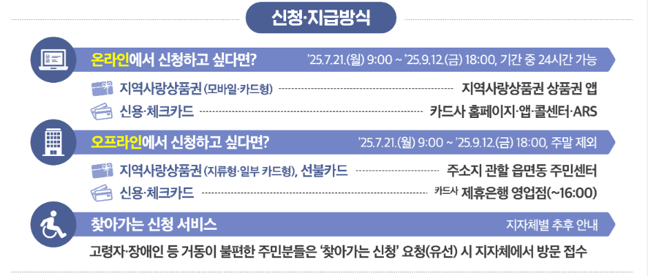 - 신청 방법: 온라인(카드사·상품권 앱), 오프라인(주민센터·은행)
