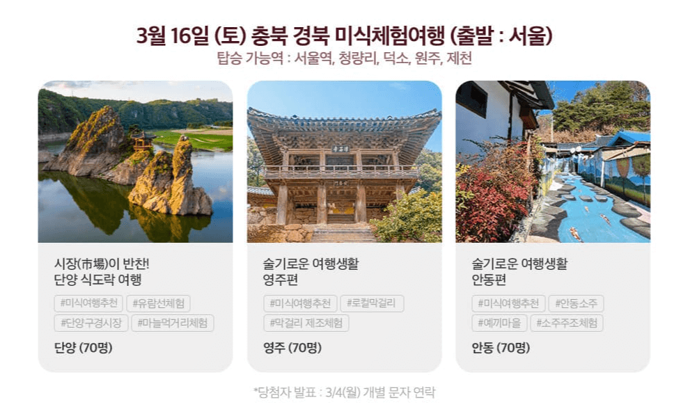 | 3월 16일(토) 충북 경북 미식체험여행 서울 출발 |